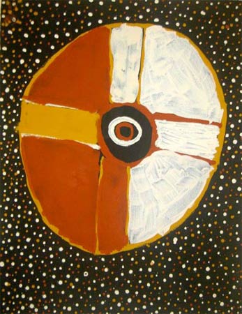 The Kulama Ceremony is performed in the late wet season (March-April) when a ring appears around the moon. Kulama is a traditional initiation for young men which coincides with the harvest of a certain wild yam species. Elders of both sexes sing and dance for three days welcoming the boys into adulthood. The boy is then renamed with his true man’s name. © Jilamara Arts and Crafts