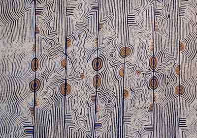 Mary has depicted designs associated with Yalka Tjukurrpa (Bush Onion Dreaming) at Murini, West of Haasts Bluff, near Winparrku, another sacred site. The Yalka is a traditional bush food represented here by the circles with meandering lines emanating from them. The long parallel lines represent creek beds, with waterholes being the concentric circles, U shapes are the women and the short parallel lines are wana (digging sticks) and trees.