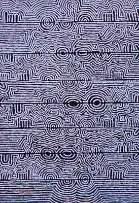 Mary has depicted designs associated with Yalka Tjukurrpa (Bush Onion Dreaming) at Murini, West of Haasts Bluff, near Winparrku, another sacred site. The Yalka is a traditional bush food represented here by the circles with meandering lines emanating from them. The long parallel lines represent creek beds, with waterholes being the concentric circles, U shapes are the women and the short parallel lines are wana (digging sticks) and trees.