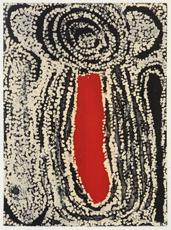 This etching depicts designs associated with Wirrulnga, a rockhole site in a small rocky outcrop east of the Kiwirrkura Community in Western Australia. In ancestral times a group of women camped at this site. The women are represented by the two arc shapes beside the roundel. As they traveled they gathered the bush food known as kampurarrpa or desert raisin. These berries can be eaten straight from the bush but are sometimes ground into a paste and cooked in the coals to form a type of damper.
