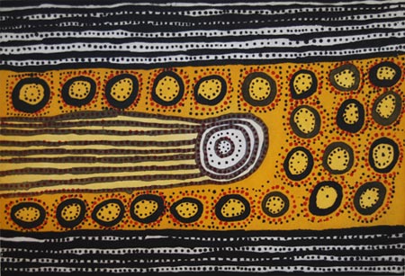 Ken’s etching depicts a story from his father’s country, Walpirnta, west of Tjukurla. There were important men travelling and camping through country on their way to business. ‘This is me and my father’s tjukurrpa (dreaming)’. This year I saw Walpirnta from a helicopter. It was the first time it made me really happy to see the place my father had told me about. This painting tells a very storng story, I can’t tell you anymore. © Warakurna Artists