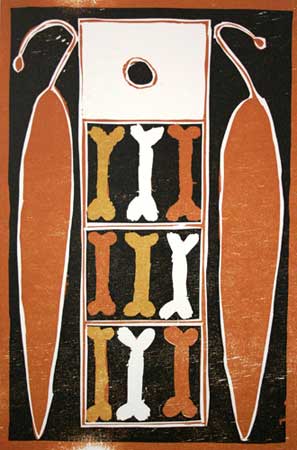 This work is part of a series of limited edition reduction woodblock prints by artists from Elcho Island titled ‘Elcho Elements’. Each work explores the relationship the artists have with the four natural elements on the island, (earth, fire, water and sky) through their moiety, clan and persona.