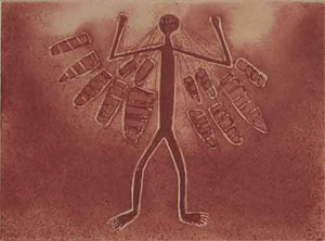 As she traveled, she left more spirit children and instructed them to speak specific languages. She planted yams and told the spirit children they were good to eat. She also told the children of other bush foods such as water lilies and sugar bag (wild honey). The beautiful ochre depiction on the sandstone of Injalak Hill, is the only known rock art image of this important ancestor.