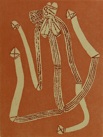 Roderick gains much inspiration from the rock art of old, often utilising the single line rarrk in his painting rather than the cross hatching style used by many artists today. In this etching he has depicted a mimi figure. Mimis are the original spirit beings. According to the Kunwinjku people of western Arnhem Land they existed before humans and subsequently taught Aboriginal people everything they needed to know. Mimis taught ceremonies, dance, song, hunting and all bush skills. The spirits continue to live in rocks, trees and cave but are rarely seen by humans.