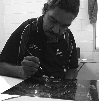 He has been moving around a lot living in Peppimenarti and Darwin and attending three different high schools: Kormilda, St. Johns and Yirara Colleges. He really enjoyed his time at Kormilda where he spent most his time in the art room. He has also studied at Bachelor College where he finished art classes and a business, office, administration course. Now he is settled in Daly River happy to be in the place he calls home. He has developed immensely as an artist the last years developing his own distinct style. His designs vary from colourful bush tucker depictions to clean and beautiful black and white designs. Phillip is currently working as a Trainee Aboriginal Health Worker. When not working Phillip will produce outstanding and detailed art pieces whenever possible.