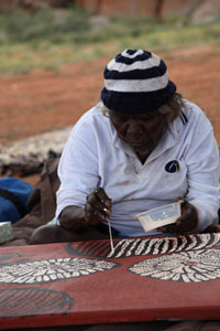 Ningura Napurrula was born at Watulka, south of the Kiwirrkura Community, circa 1938. She married Yala Yala Gibbs Tjungurrayi and together with their young son Morris they went in to the Papunya Community after meeting up with Jeremy Long during one of his Welfare Patrols. Ningura completed her first paintings for Papunya Tula Artists in 1996 and was exhibited that same year. In 1999 Ningura contributed to the Kintore women’s painting as part of the Western Desert Dialysis Appeal. Later in 2003 she was chosen along with four other Papunya Tula Artists to have one of her paintings represented on an Australia Post international stamp. In 2004 Ningura was one of eight Aboriginal artists selected to have an example of their work incorporated into the architecture of the Musee du Quai Branly in Paris. This museum opened in June 2006, and houses the French collection of art from Africa, Asia, Oceania and the Americas.