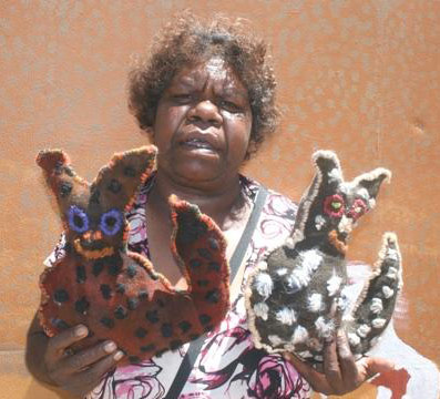 Marlene was born in Alice Springs. Her mother’s country is Hermannsburg (Ntaria), west of Alice Springs. Marlene grew up at Amoonguna community, east of Alice Springs, where she went to school. Marlene is sister to the important watercolour artist Mervyn Rubuntja. Marlene learnt to sew at Yirara College, Alice Springs, however she only began making soft sculptures at Yarrenyty Arltere in 2009. She says she draws inspiration for her soft sculptures from what she sees around her in her daily life at Yarrenyty Arltere Town Camp; “some things are good for people and other things make people really mad”. She also draws inspiration from her husband’s country at Wave Hill. Marlene is interested in telling proudly the stories of her ancestors; her art is helping her to do this.