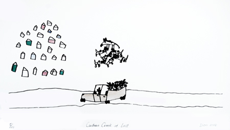 The ‘camp’ dogs that live around Tennant Creek in remote northern Australia are a constant source of fascination for Dion. He draws them in a variety of moods and situations. His depictions stem from acute observations made while driving around Tennant Creek or sitting on his grandfather’s lawn watching events unfold at Mulga Camp.