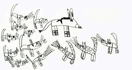 A group of dogs barking at a donkey from Canteen Creek. The donkeys come into the community turn on the taps for a drink. They are often confronted by groups of dogs barking at them and a lot of noise is created between the sounds of the donkeys braying and the dogs barking. © Dion Beasley