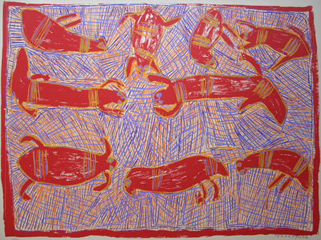 AS TOLD BY THE ARTIST: Wayin (bird), garkman (frog), dhambalingu (blue tongue lizard), miyapunu (turtle). The different animals you see during hunting. In fresh or salt water areas. © Buku Larrangay Mulka and the artists