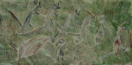 My two sister came down looking for me. I was sick and laying in the grass. We walked to Garthalala The hospital plane came and took me to Nhulunbuy and then flew me to Darwin hospital. I survived to tell the story. In this story is my watu (dog), my two sisters, Marrakaritj(angry) Baffalo and me.