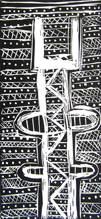This Linocut by Rachel was produced in collaboration with printmaker Martin King from the Australian Print Workshop in Melbourne. The Australian Print Workshop (APW) has an ongoing relationship with Jilamara Arts & Crafts, which began in 1995. Since then APW has undertaken several return trips to the Island. These visits have been complemented by visits to the Melbourne workshop by several of the Tiwi artists.