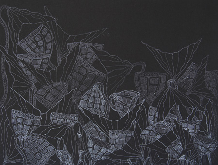 This print shows the very beautiful lotus lily which is found in the many billabongs around the Daly River region. The seeds from miwulngini (lily pods) may be eaten raw or roasted over coals. These seeds are a rich and abundant food source for the Aboriginal people of the Daly River.
