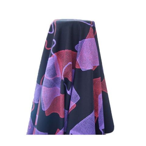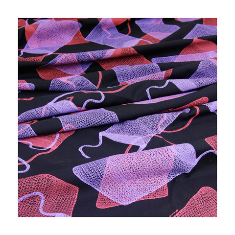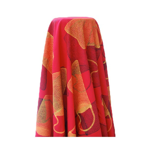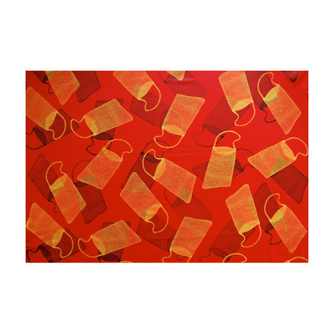 This dilly bag fabric design is by Alanga Nganbe from Wadeye Community, Port Keats, Northern Territory. The women go out into the bush and collect thithimampe (sand palm) to make the string for the bags. They then dye the string with all the different colours they get from tree roots, bark and berries.